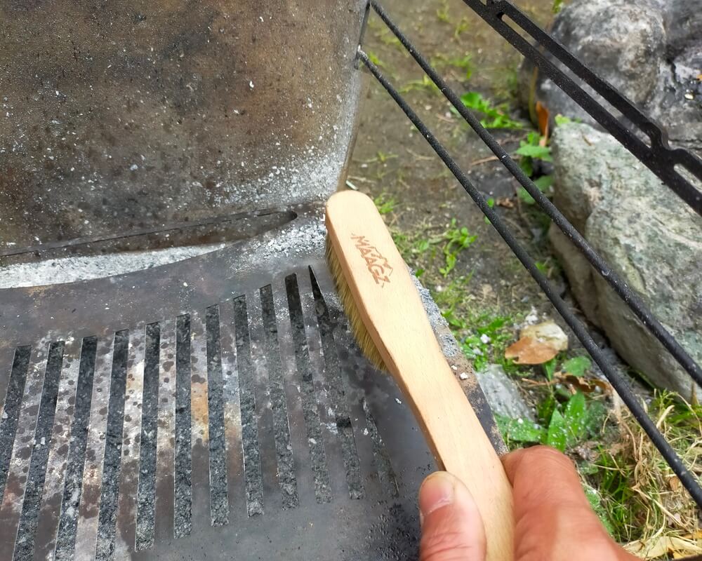 焚き火台の表面についた灰を、ブラシやたわしで払いましょう。ブラシにはMAAGZから販売されている「猪毛の焚火台そうじブラシ」が便利です。