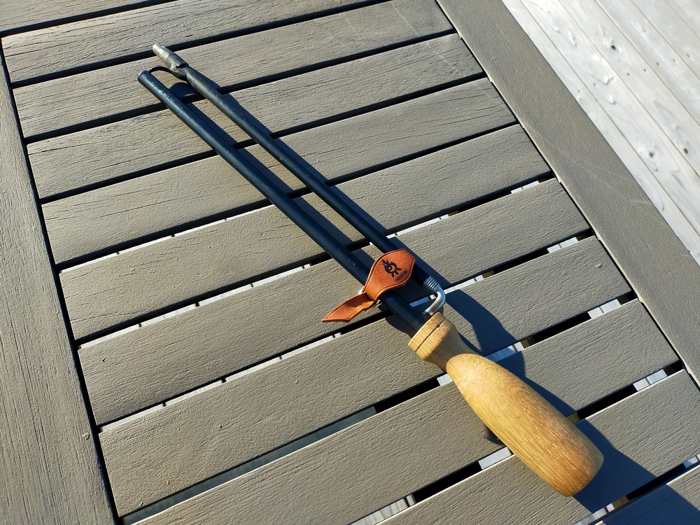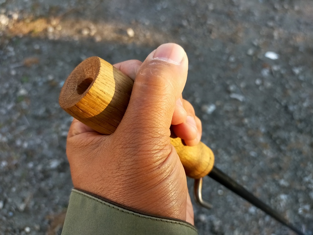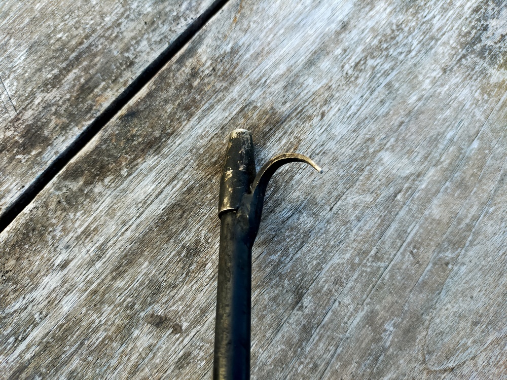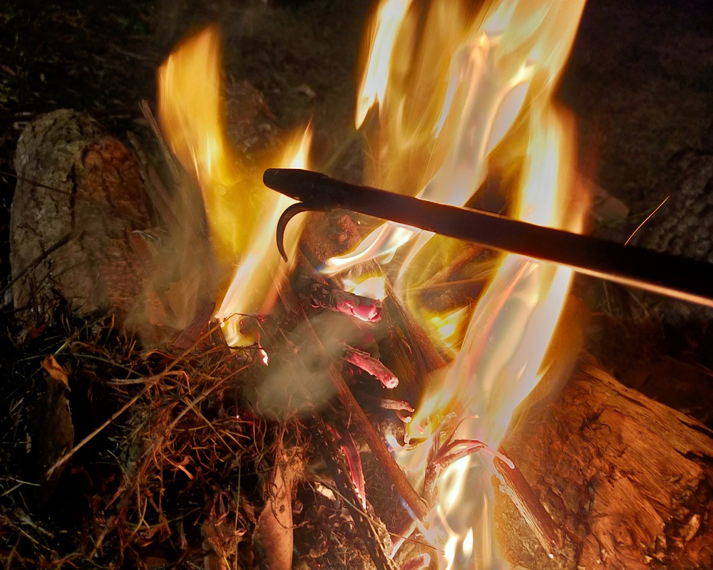 ブレストゥファイヤの先端にはフックがついています。このフックのおかげで、火搔き棒としても使用できるので非常に便利です。慣れれば、焚火の中で燃えている薪や炭の位置を、自在に変えることができます。