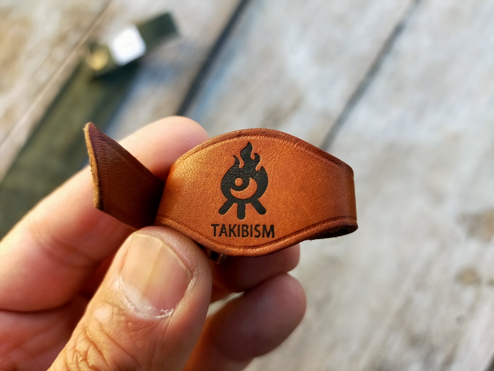 コンパクトにした上部パーツと下部パーツは、革製のバンドで付け根を締めて固定します。Dリングで締める仕組みなので、長年使用して革が伸びてしまった場合も、バンドとしての機能を落とすことなく使用ができます。革の質感も良く、焼印されたブランドロゴが渋いですね。