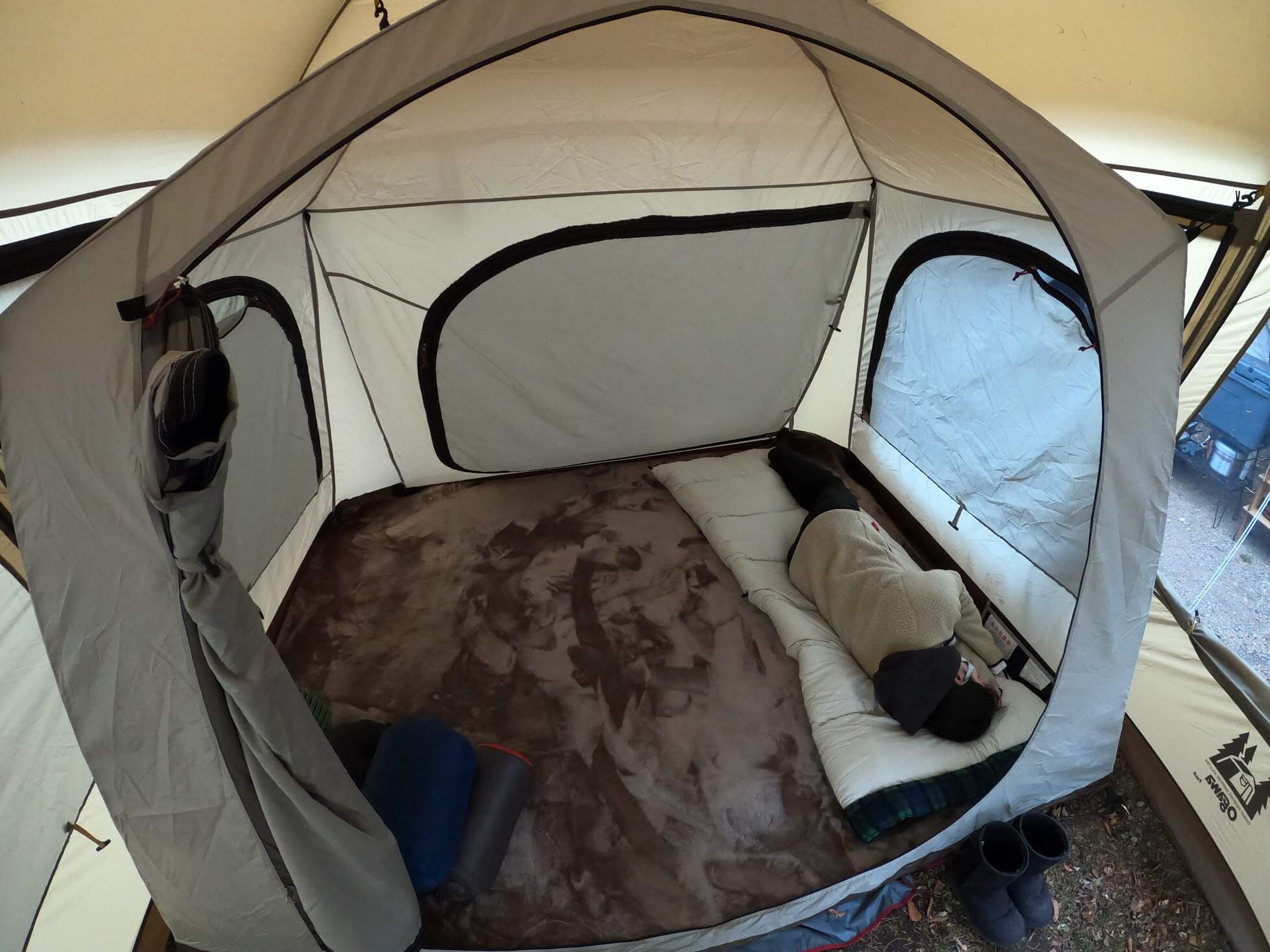 PVCマルチシートの上はインナーテントです。ogawaのインナーテントはフロアが分厚い素材感で、冬場にとても快適に過ごすことが出来ます。