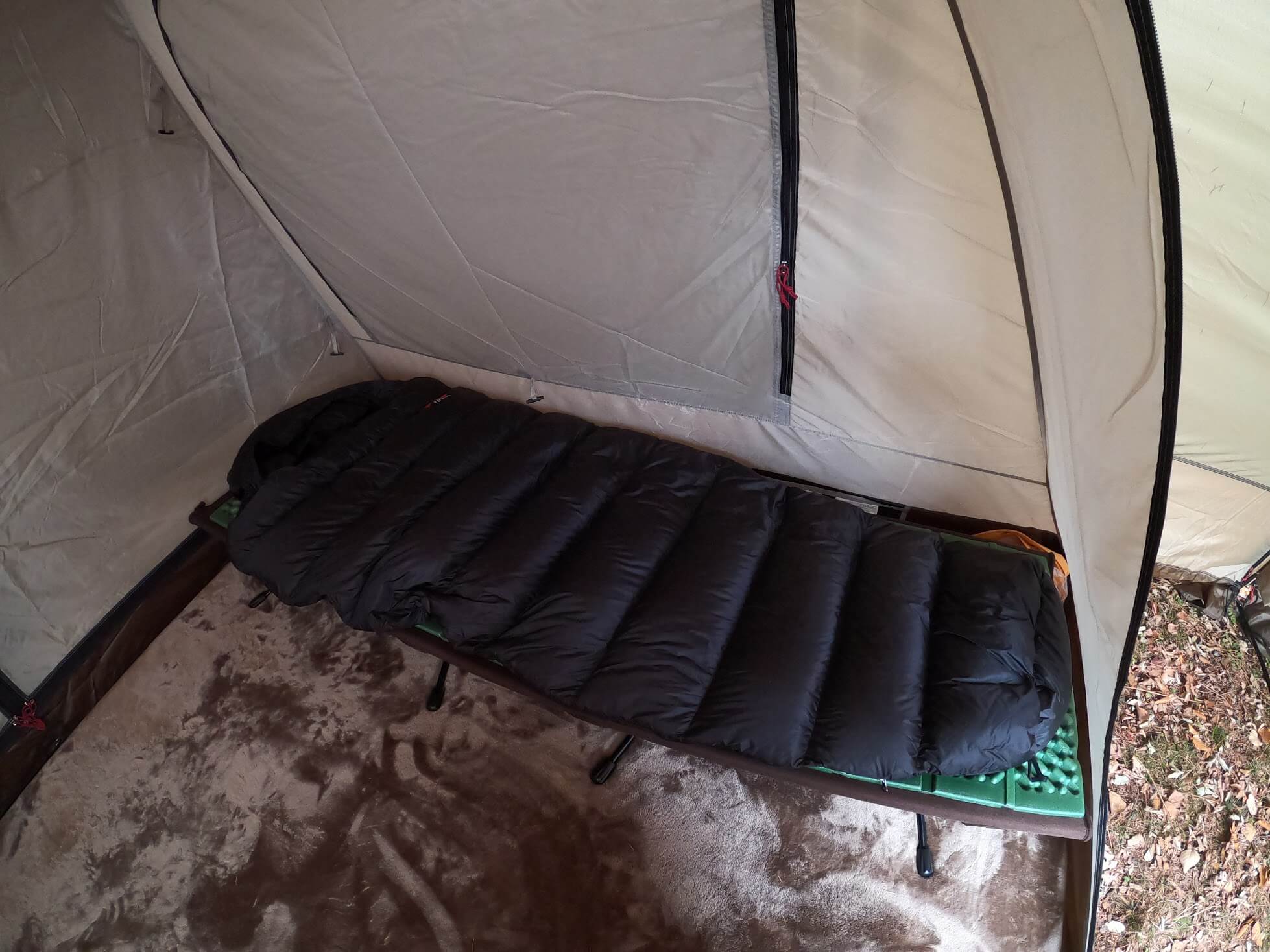 ただし、コット+シュラフのみですと、背中側のシュラフのロフト(膨らみ)が減って、背中が寒くなってしまいます。結果、却ってコット無しよりも寒く感じてしまいます。