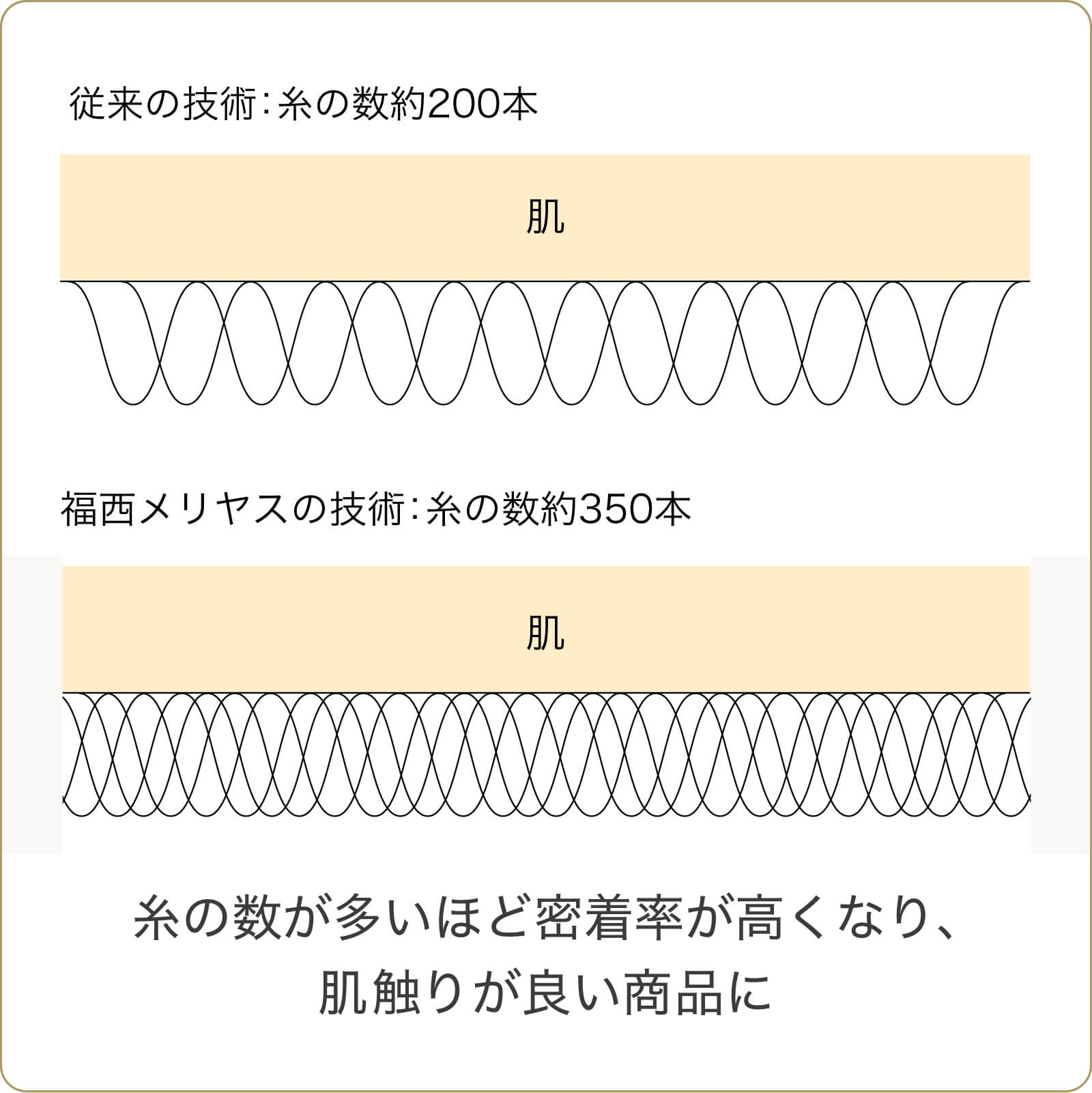 ふんわりとした柔らかい肌ざわりを追求、長年培ってきた技術力を活かし、通常の商品よりも多い、約350本(通常200~250本)もの針数を使用。質の高い国産糸をきめ細かく編み上げています。糸が多いことで、肌ざわりの良い糸がより肌に密着し、着心地がよくなります。また、編み目が細かくなることで、虫除け効果を高めます。