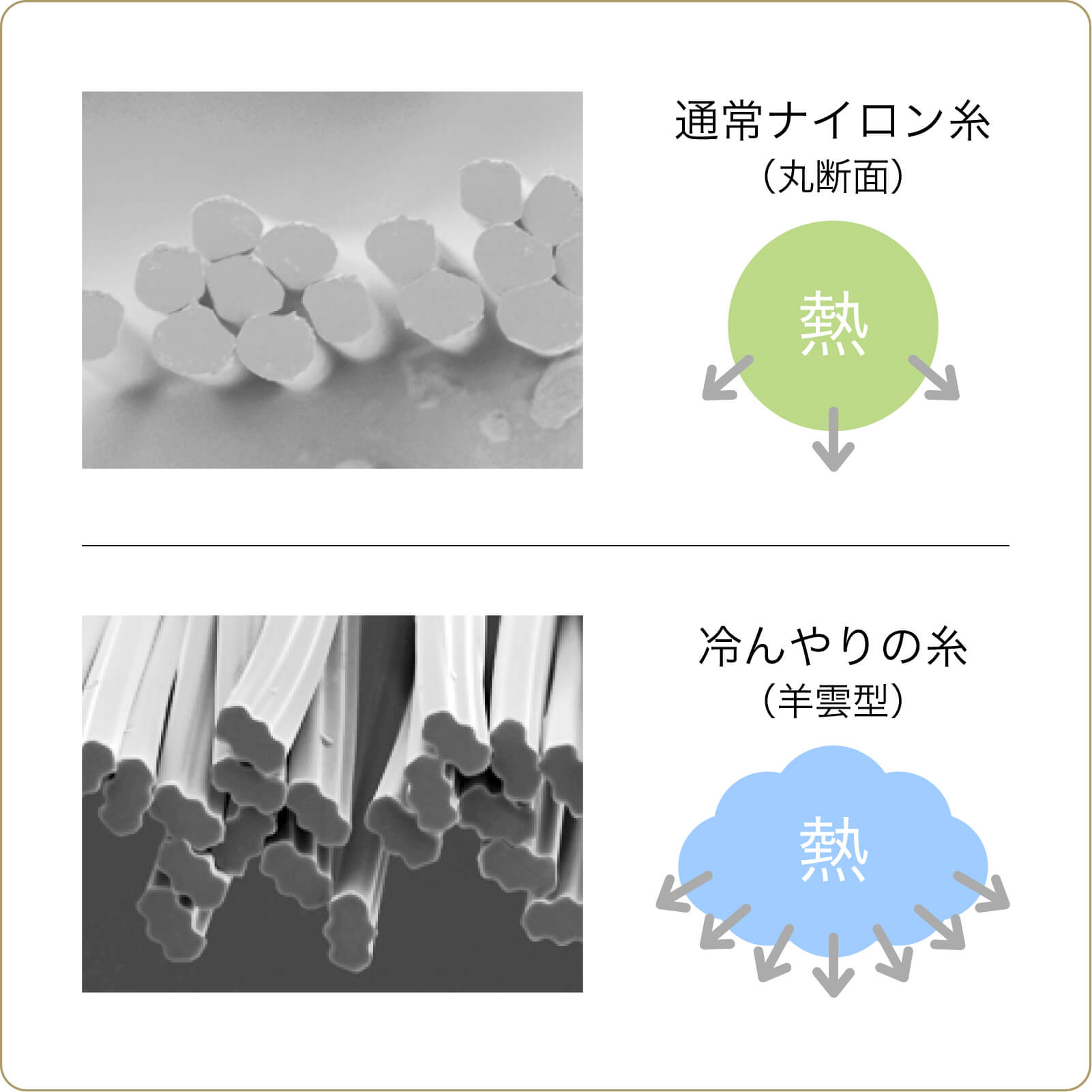 冷感機能も付いています。糸の形状が羊雲型となっており、通常のナイロンよりも熱を逃す仕組みです。非常に細かいこだわりですよね。