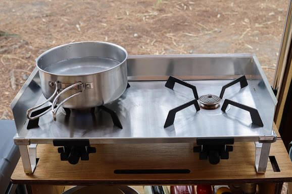 ちなみにツーバーナーはSOTOのレギュレーター2バーナー GRID ST-526を使用しています。ゴトクの形状がこのように4本脚仕様となっており、手前に荷重がかかる調理器具との相性が良くないのですが、fan5duoのクッカーはどれもしっかり安定してくれました。