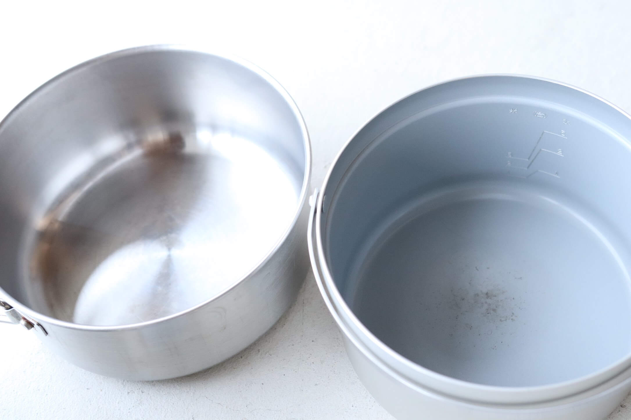 アルミニウムフッ素加工(右)で、びっくりするぐらいご飯が全くこびり付かないのが助かります。※左はステンレス片手鍋です。