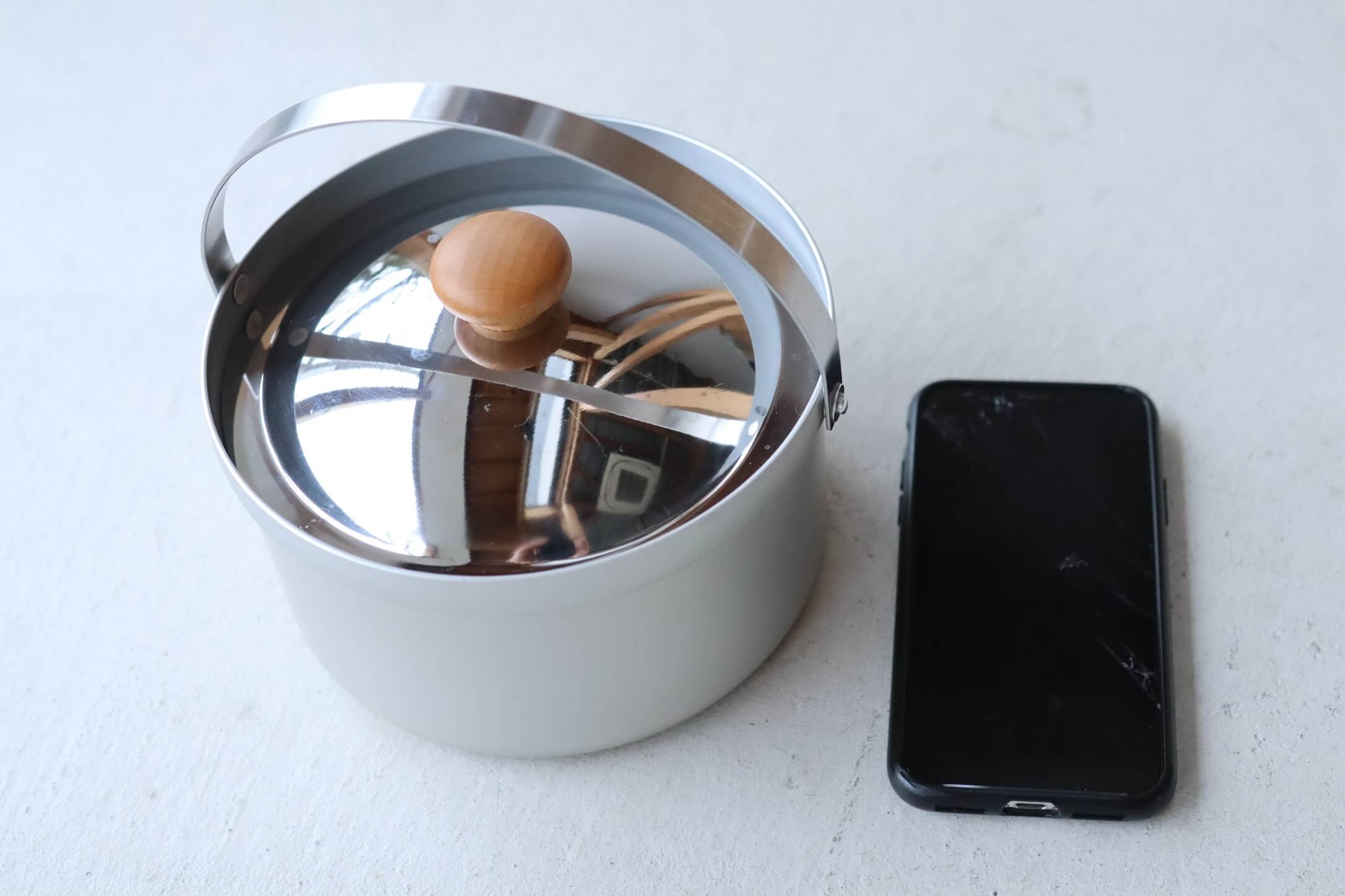 蓋付きです。iphoneXとの比較。2〜3人分のスープ料理などを作るのに適したサイズ感、といった感覚でポトフなどをよく作ります。