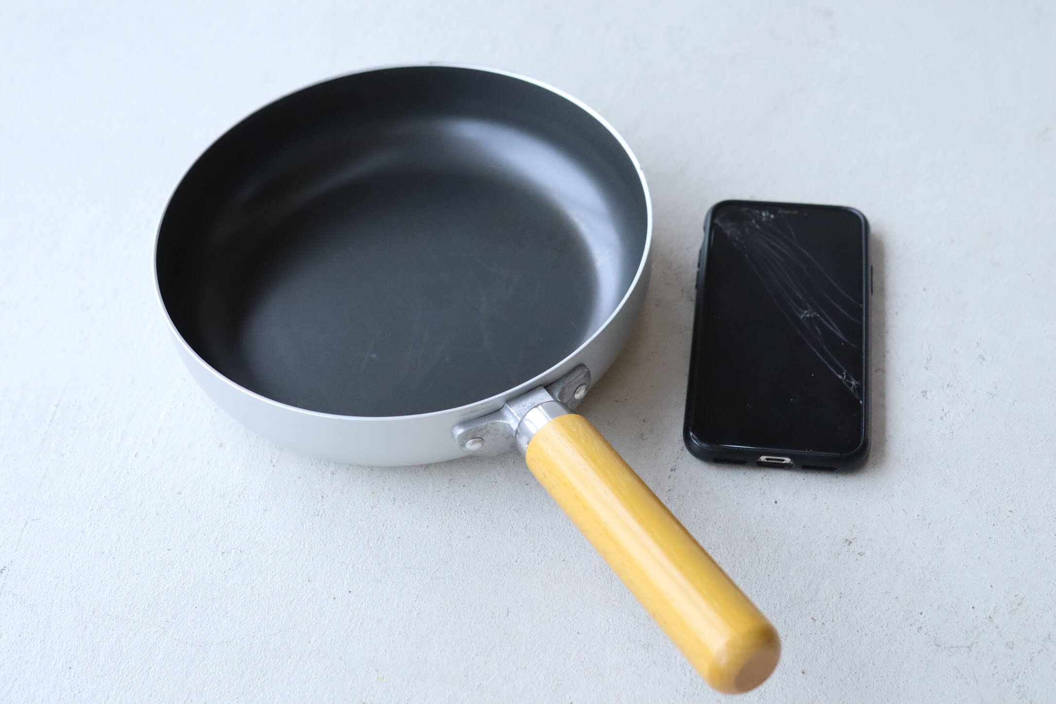 サイズ感。iphoneXと比較。ちなみにフライパンの蓋は、大鍋とフライパン共用となっています。