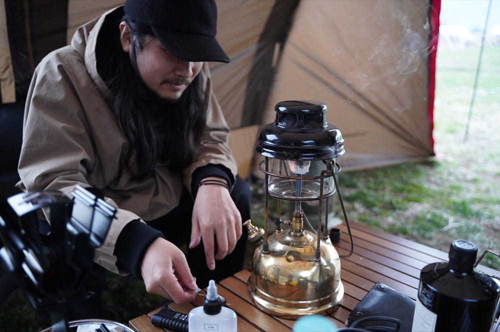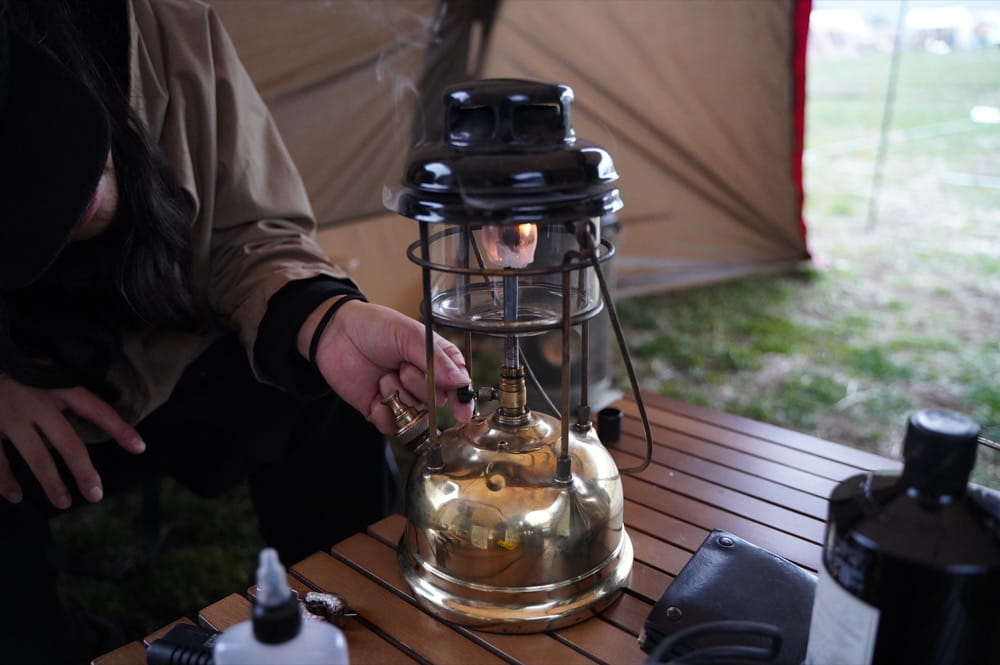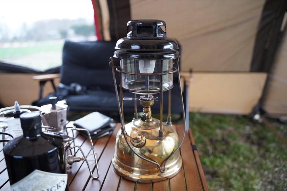 メインランタンはTilley(ティリー) X246 “The Guardsman” ガーズマン。イギリスのヴィンテージ品で燃料はケロシン(灯油)。