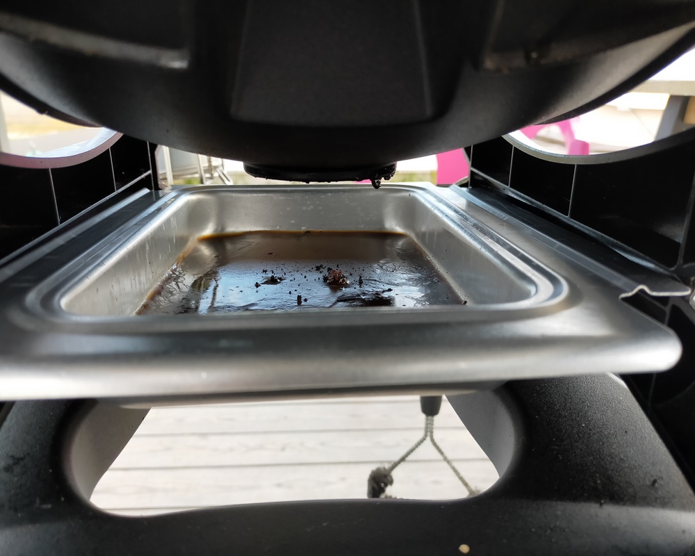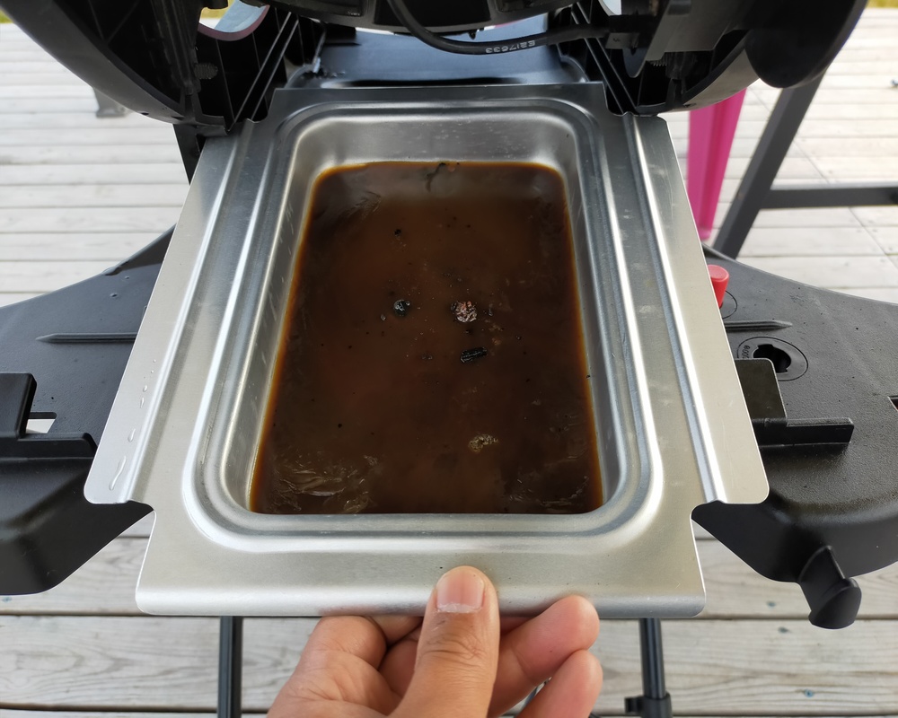 調理の際に落ちた油や、食材の切れ端などはトレイにたまります。中身を捨てて、トレイを洗剤で水洗いするだけで後片付けが完了します。