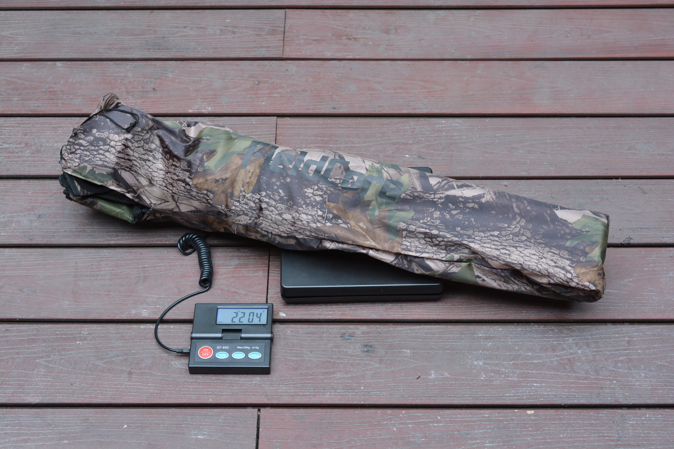 (収納ケースにもFieldCoreのロゴが!そしてリアルツリーカモ柄。ぺらっとした生地です)