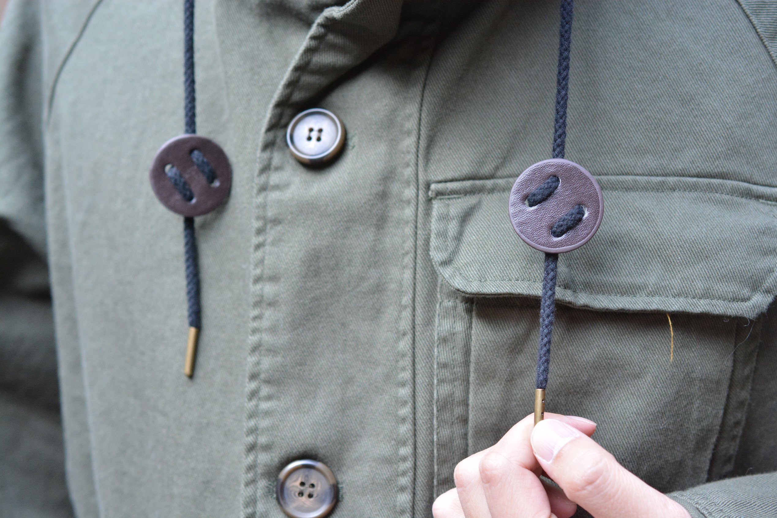 ボタンも直径2cmぐらいの大きめサイズで、ウッド調のシックなものです。さらに難燃素材を採用しているとのこと。