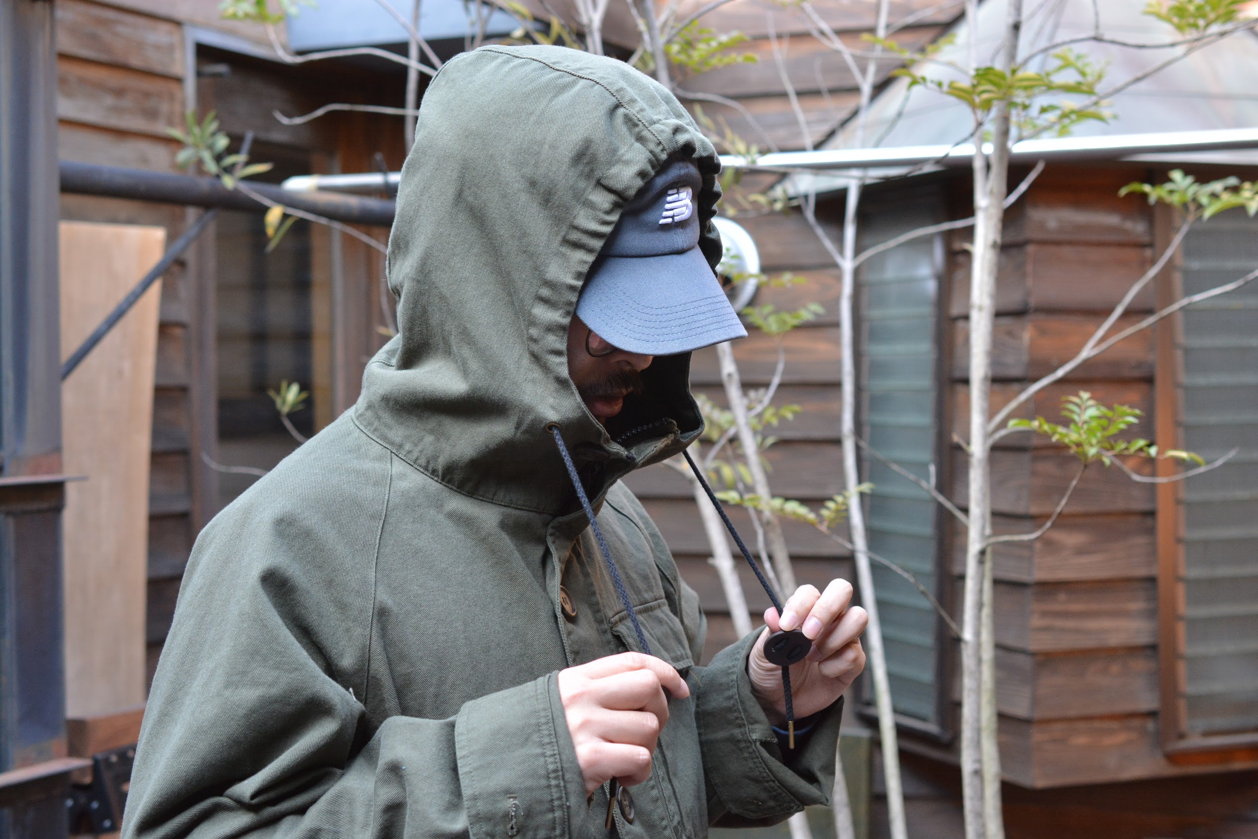 大きめなフードは、帽子を被っていてもガバッと覆ってくれて、紐で絞れる仕様。