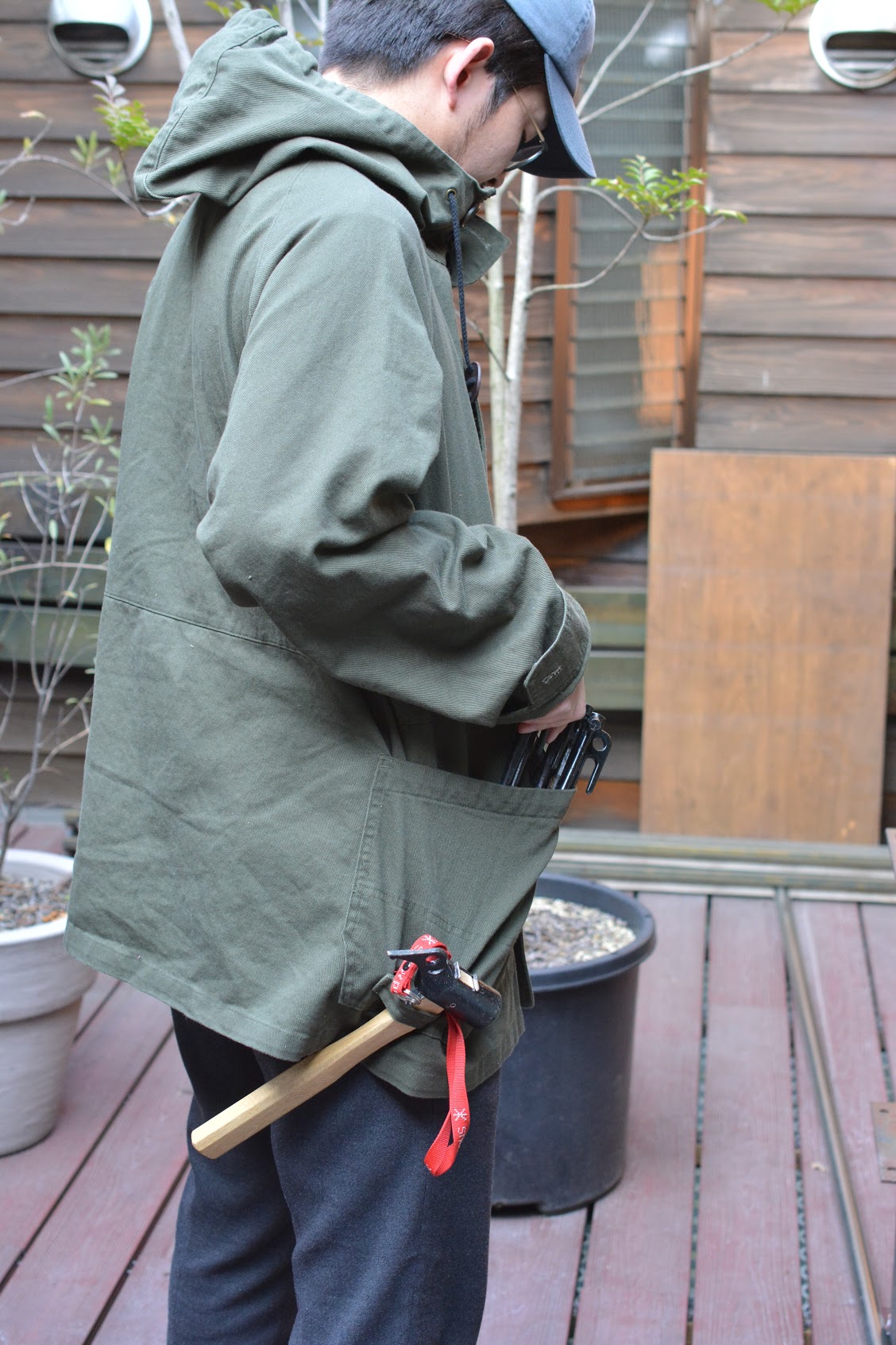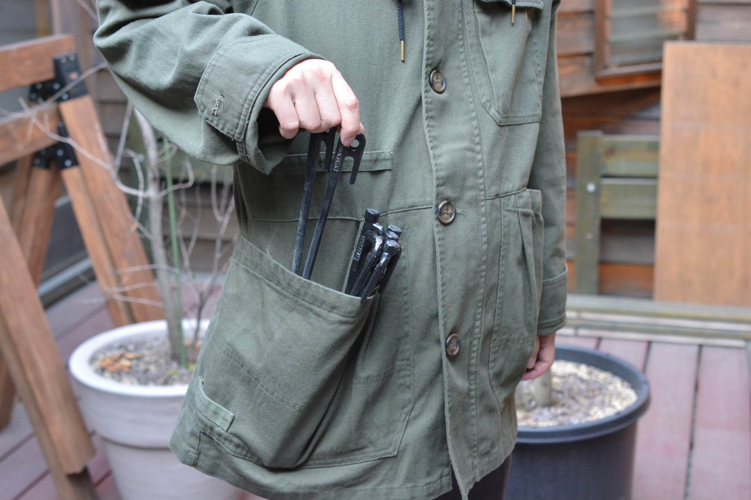 後ろ身頃まで回り込んでいる巨大なポケット。キャンプギアをガシガシ格納出来るぜ!ペグが入ります。
