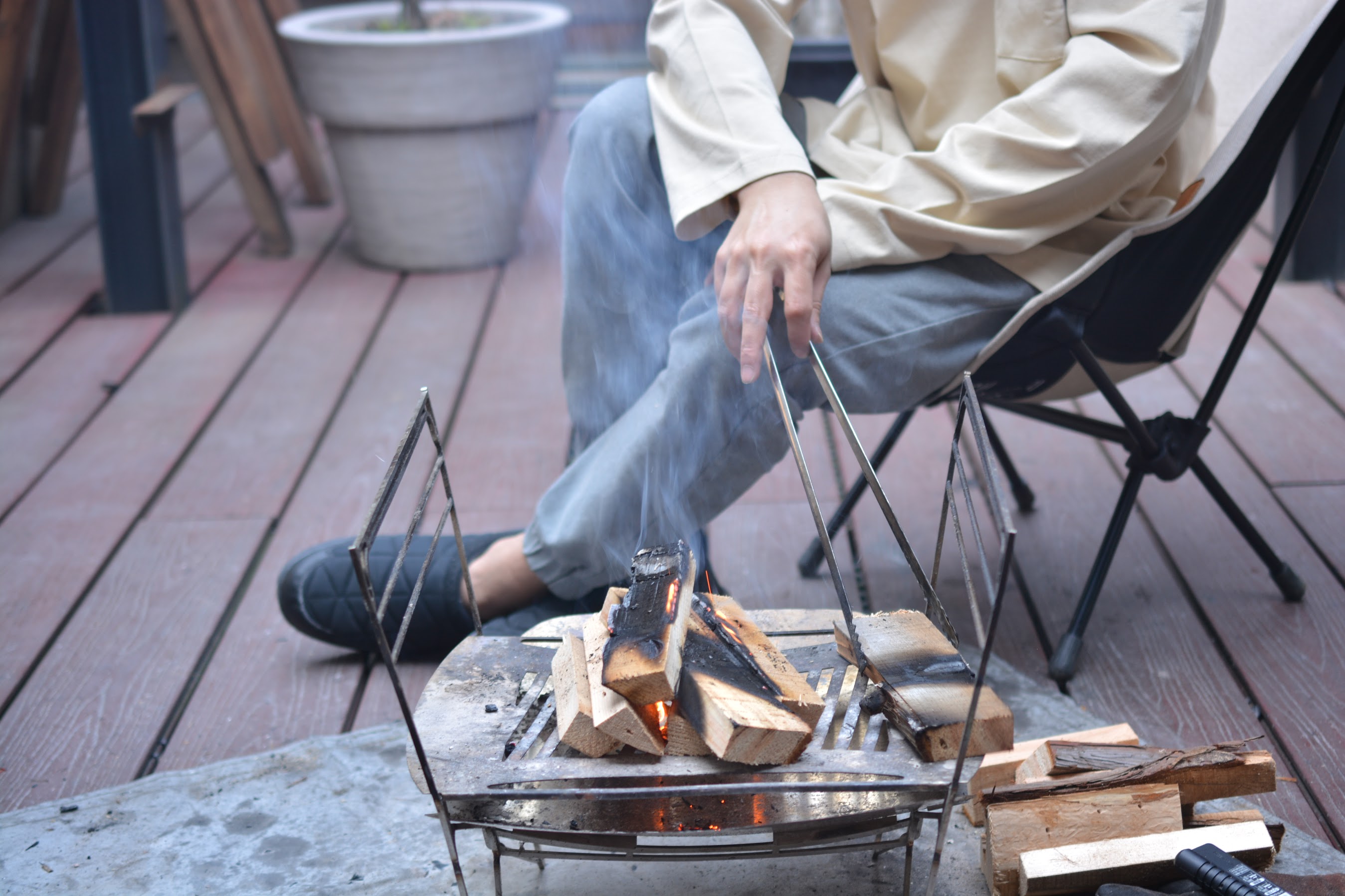 燃えにくい綿100%素材ですので、早速焚き火ロンTとして使ってみました。