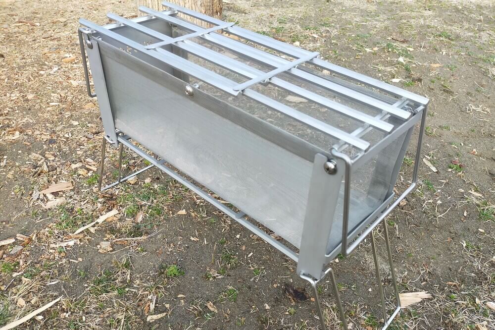 ヨコナガメッシュタキビダイは、鉄職人が手仕事でひとつひとつ丁寧に仕上げている焚き火台です。