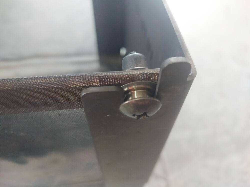 フレームの上部にあるパネルの4隅には凹みがあります。メッシュ部分の4隅にあるビスをはめて、フレームとメッシュをしっかりと固定しましょう。