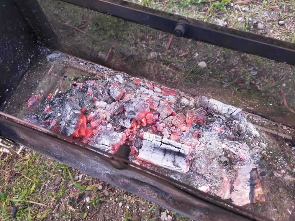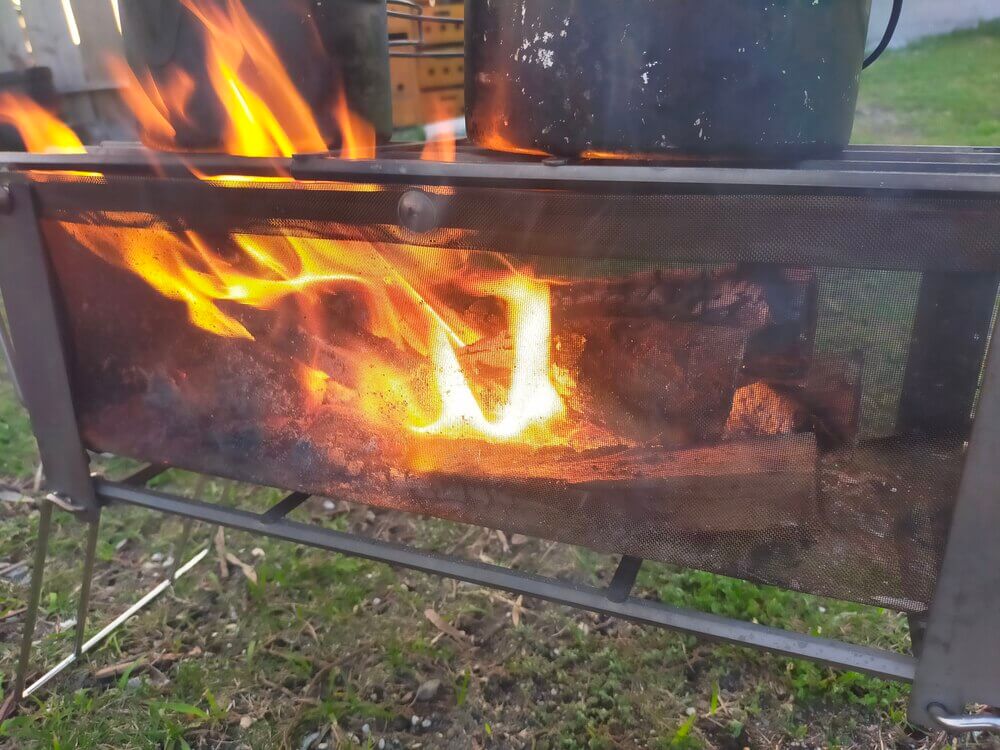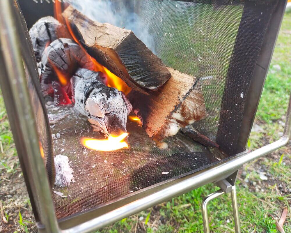時々、風が吹いていたので、メッシュ部分が適度に風を通し、火吹き棒などで酸素を送る必要なく炎の維持ができました。