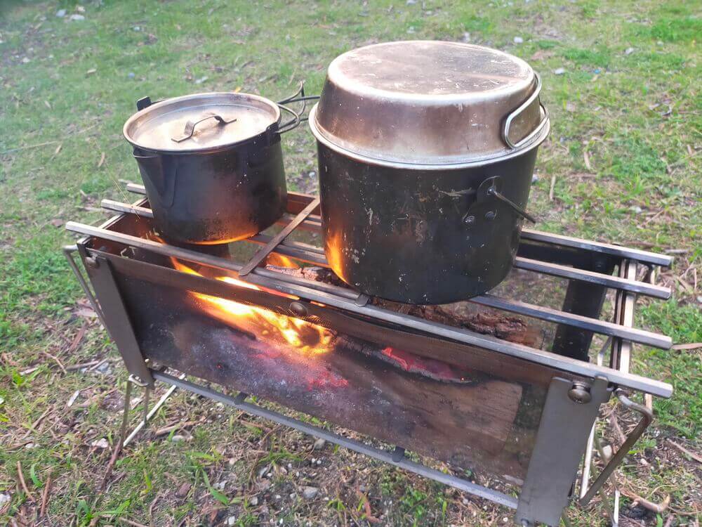 ヨコナガメッシュ焚き火台は別売りのスライドゴトクを併用することで、重量のある調理器具でも難なく調理ができます。